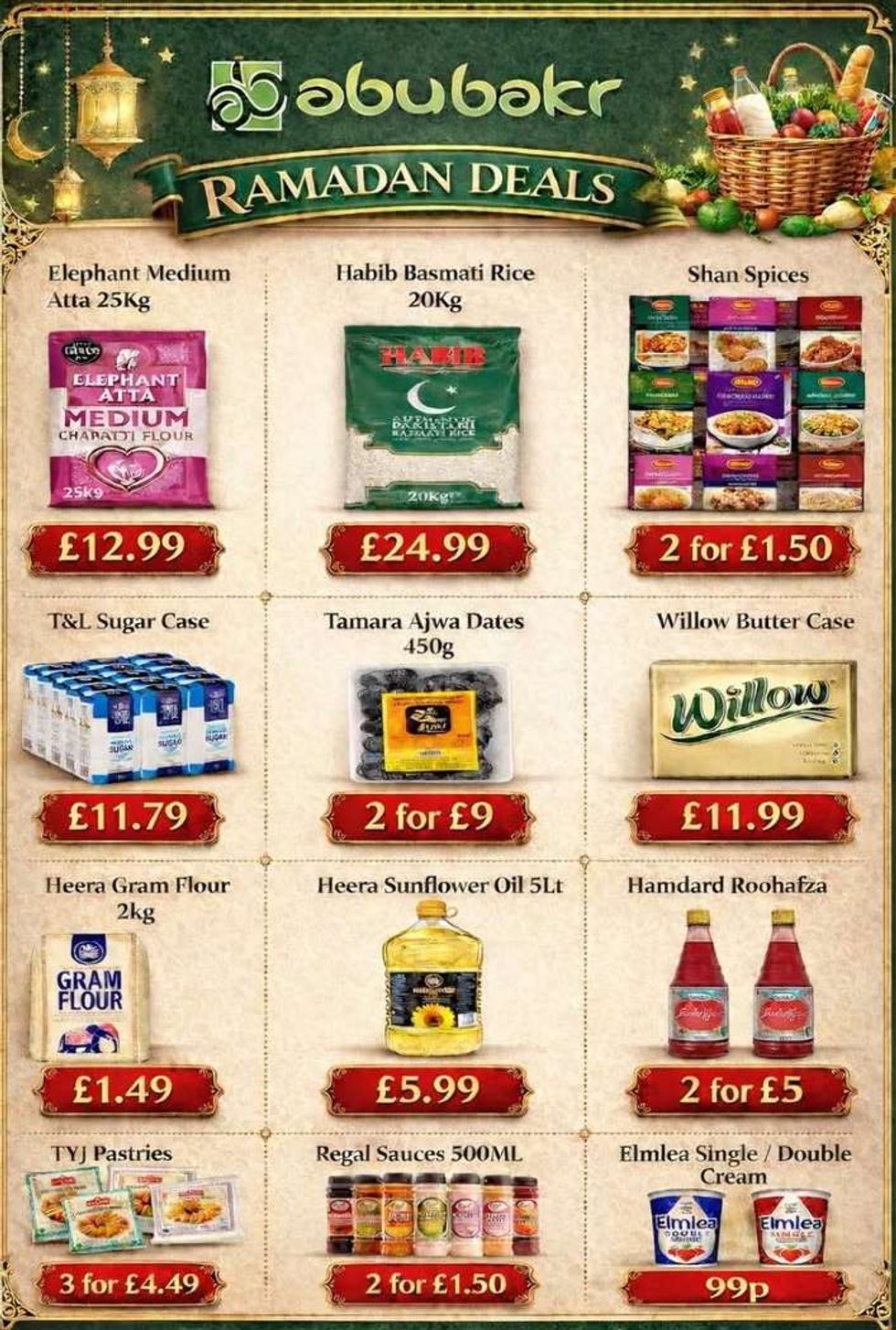 The retailer’s promotion includes discounted staples such as Elephant Medium Flour 25kg, Habib Basmati Rice 20kg, Shan Spices, Willow Butter Case, T&L Sugar Case, Tamara Ajwa Dates 450g, Heera Gram Flour 2kg, Heera Sunflower Oil 5lt, Hamdard Roohafaza, TYJ Pastries, Regal Sauces 500ml and Elmlea single/double cream.
